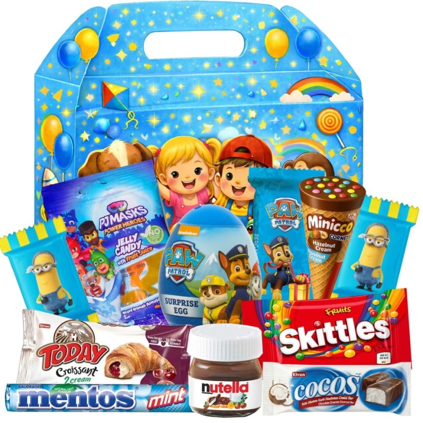 - Cutie Cadou Blue – O cutie veselă, colorată, plină de surprize dulci pentru cei mici.