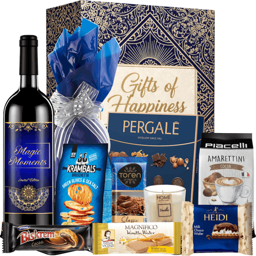 Un cadou festiv cu 11 produse premium, de la vin roșu și cozonac la praline fine, simbol al rafinamentului și generozității.